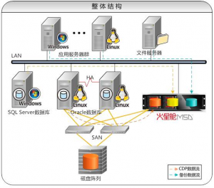 如上图所示数据安全保障整体架构,火星舱数据保护设备提供CDP功能和定时备份功能,分别实现数据库数据、系统级文件数据的实时复制与定时备份。部署火星舱数据保护设备提供FC接口和以太网接口,分别接入SAN网络和LAN网中,并将火星舱设备中的存储空间分为三部分,分别用于存储SQL Server、Oracle、以及文件等备份数据。